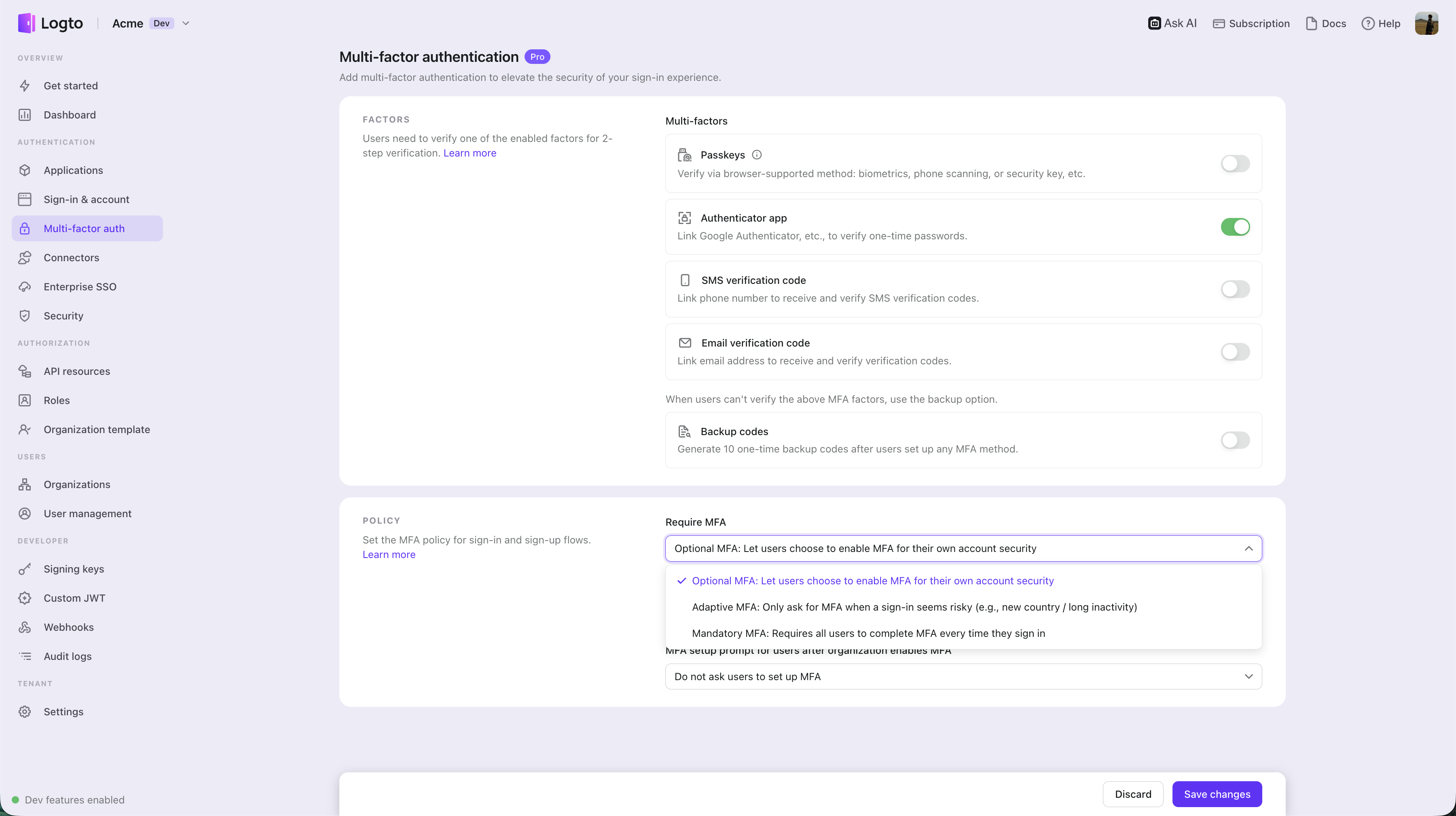 Logto provides flexible MFA configuration options to meet different security requirements. You can configure MFA at the global level for all users or enable it on a per-organization basis for multi-tenant applications.
